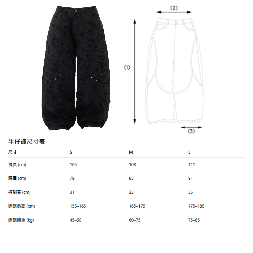 版型剪裁: 經典直筒寬鬆剪裁 (Straight Fit),採用時髦的低腰設計 (Low-rise),褲長呈覆蓋腳踝 (Full-length) 的垂墜效果,拉長視覺比例。