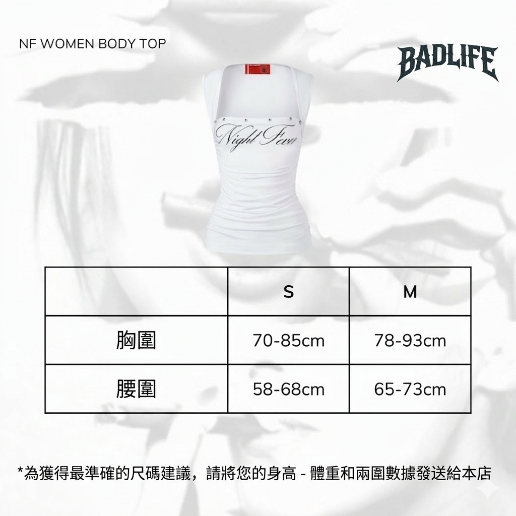 模特兒參考: 圖中模特兒穿著 S 碼(胸圍 83-85cm),呈現緊身包裹效果。若您的數值較小,穿著感將較為合身。